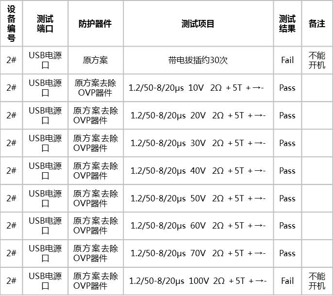 某客戶的智能手持式POS機(jī),使用的是USB口作為整機(jī)的電源輸入口,在使用過程中,經(jīng)過數(shù)次帶電拔插,設(shè)備就不能開機(jī)了,電源輸入異常。拆機(jī),測(cè)量USB電源兩端為短路,查出為OVP芯片短路所致。由于去除了OVP器件,客戶擔(dān)心實(shí)際使用過程中會(huì)存在應(yīng)用風(fēng)險(xiǎn)。故,提出EOS滿足200V的測(cè)試要求。