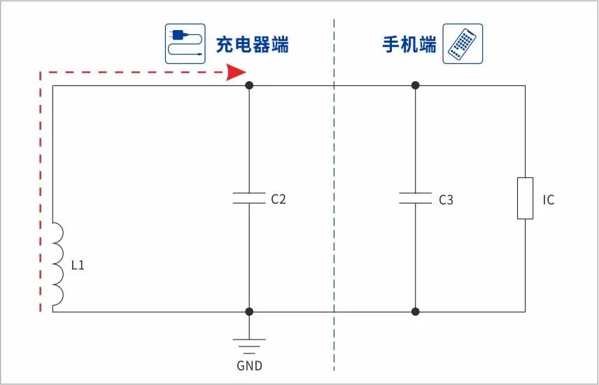 如上圖,總會(huì)存在一些斷開(kāi)充電的瞬間,漏感L1給C2、C3充電,除此之外,充電端到手機(jī)端整個(gè)充電回路其實(shí)也有電感存在。總之我們都可以把他看著是L1 。