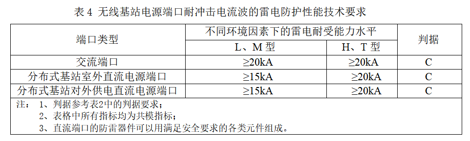 以下是《YD/T 2324—2011 無(wú)線基站防雷的技術(shù)要求和測(cè)試方法》,對(duì)電源端口的雷擊防護(hù)要求: