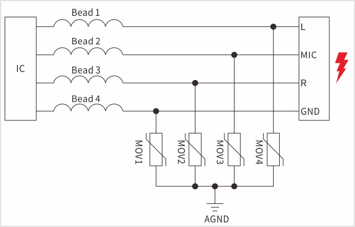 原理如(圖2),左邊是音頻解碼芯片,客戶(hù)串聯(lián)30歐姆的磁珠,接口采用高VC低IPP封裝0402的壓敏器件,右邊是耳機(jī)音頻接口。