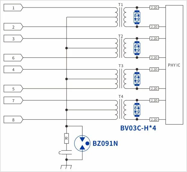 網(wǎng)口防護(hù)電路大致如(圖1),客戶初級側(cè)共模浪涌采用90V的GDT——BZ091N,次級采用低容BV03C-H做差模防護(hù),抑制浪涌或ESD電壓尖峰。 客戶反饋共模浪涌10/700us 6kV測試可以通過,端口ESD空氣15KV測試設(shè)備死機(jī)需重啟。通過溝通得知,板子面積較小空間受限,CPU與phy都靠近RJ45端口,布局大致如(圖2)。