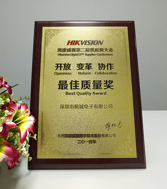 2014年,檳城電子憑借優(yōu)質(zhì)的產(chǎn)品和完善的服務(wù),在??低暤墓?yīng)商大會上喜獲“最佳質(zhì)量獎”的榮譽(yù),這對一直在努力的檳城人是一個(gè)莫大的鼓舞,我們的汗水沒有白流,我們付出得到了收獲,全體檳城人將再接再厲,創(chuàng)造出更加美好的明天!