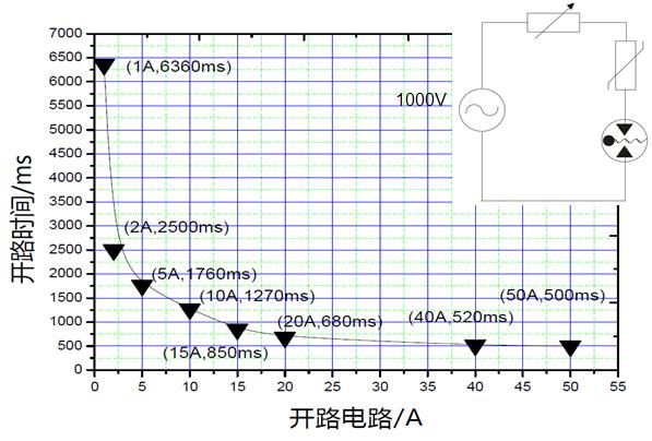開路失效氣體放電管可以滿足這三點性能,且可以在工頻過來時很快切斷電路,如下圖為開路失效氣體放電管的工頻電流和斷開時間測試曲線: