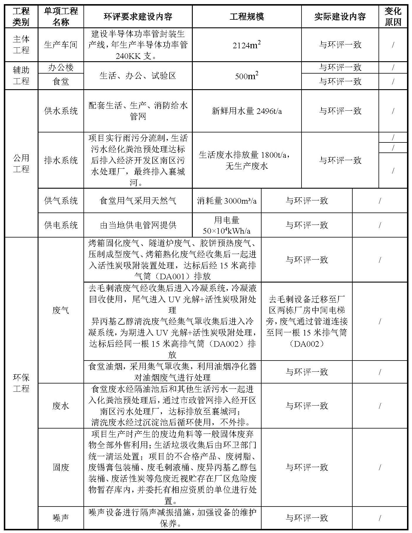 本項(xiàng)目營(yíng)運(yùn)期封裝生產(chǎn)半導(dǎo)體功率管過(guò)程中,其烤箱固化廢氣、隧道爐廢氣、膠餅預(yù)熱廢氣、壓制成型廢氣、烤箱熟化廢氣,主要污染物為VOCs。廠區(qū)內(nèi)設(shè)置了一套活性炭吸附裝置進(jìn)行處理,處理后經(jīng)15米高排氣筒(DA001)達(dá)標(biāo)排放。去毛刺液廢氣、異丙基乙醇清洗廢氣主要污染物為VOCs,各自采用冷凝+UV光解+活性炭吸附裝置處理后,處理后經(jīng)一根15m排氣筒(DA002)達(dá)標(biāo)排放。食堂油煙先由集氣罩收集,后利用油煙凈化器對(duì)油煙進(jìn)行處理后排放。