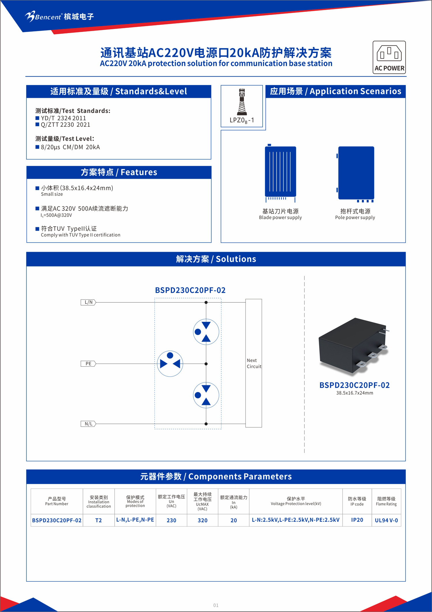針對電網(wǎng)的異常干擾,我們提供了高通流密度的防雷模塊BSPD230C20PF02: